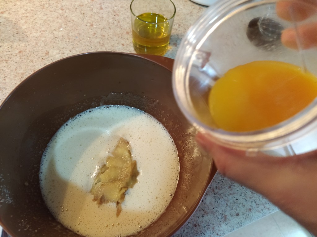 Continúa batiendo hasta conseguir una crema. A continuación, aplasta un poco el plátano y añádelo a la mezcla, el aceite de oliva, el zumo de naranja y lo remueves bien hasta que estén bien integrados todos. El zumo de naranja hace que no se ponga negro por el plátano.