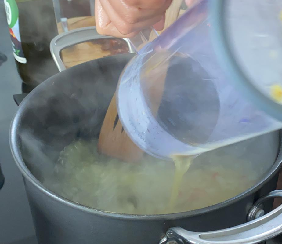 En un recipiente echar el agua junto con el caldo de verduras. Agregar a la olla.