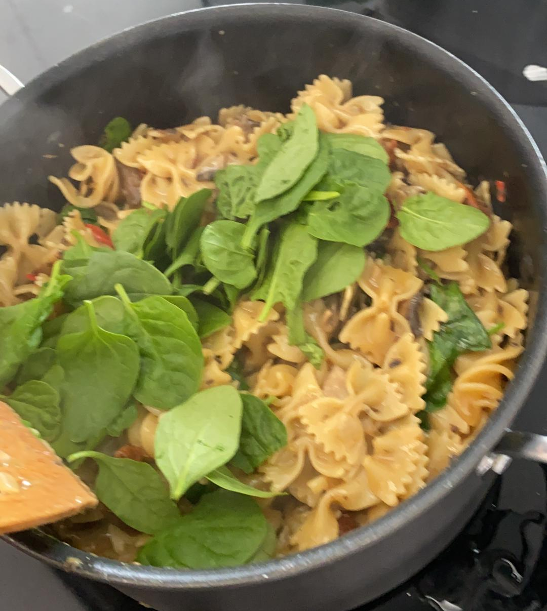 En Londres es común cocinar recetas de manera que todo se haga en una misma olla. Esto se conoce como «one pot meal». Mis primas Ainhoa y Tammy saben perfectamente cocinar de esta manera y me han dado una receta de pasta con crema de champiñones que está muy rica.