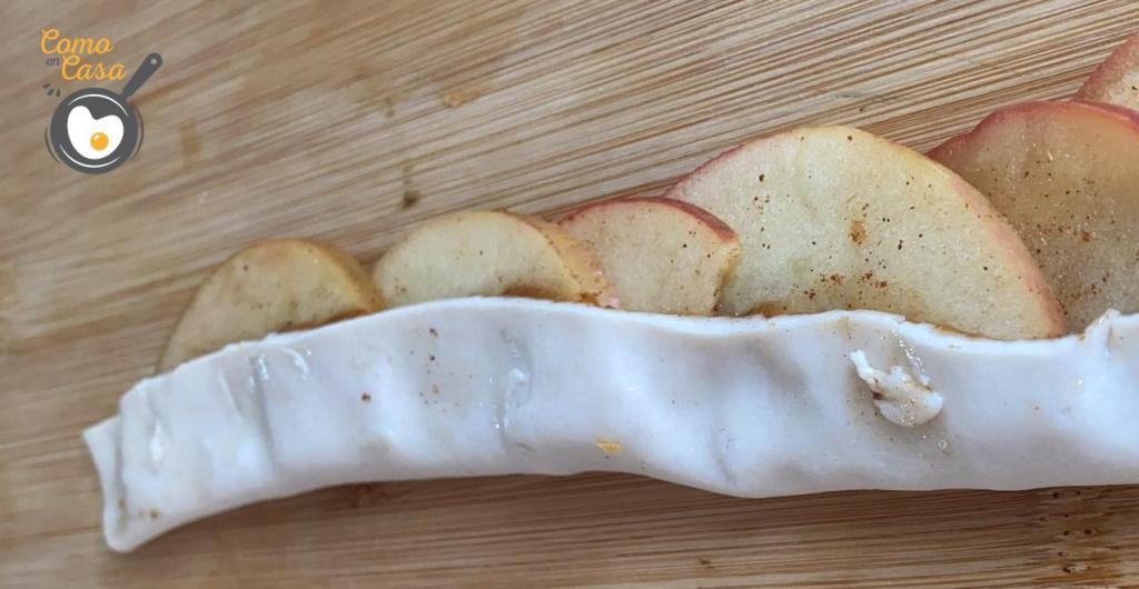 En cada tira pon las manzanas una sobre otra a lo largo, dejando la mitad de la masa libre para poder doblarla. En la siguiente imagen puedes verlo mejor.
