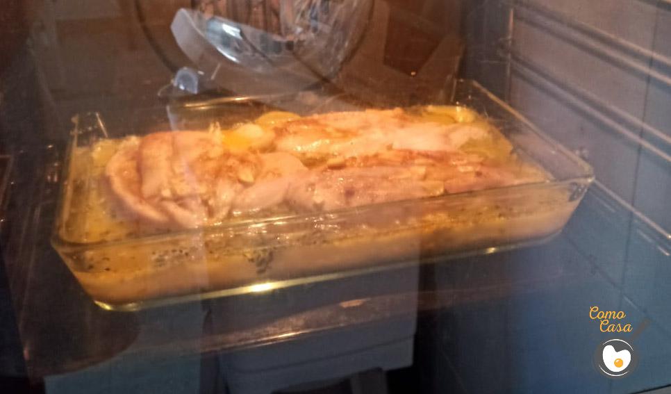 Dispon las pechugas sobre las patatas en la bandeja de horno y agrégale un chorreoncito de aceite de oliva virgen.