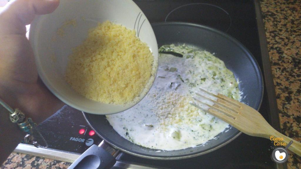 Tras unos minutos de cocinado añádele la nata líquida y el queso parmesano. Remueve y deja cocinar la salsa.