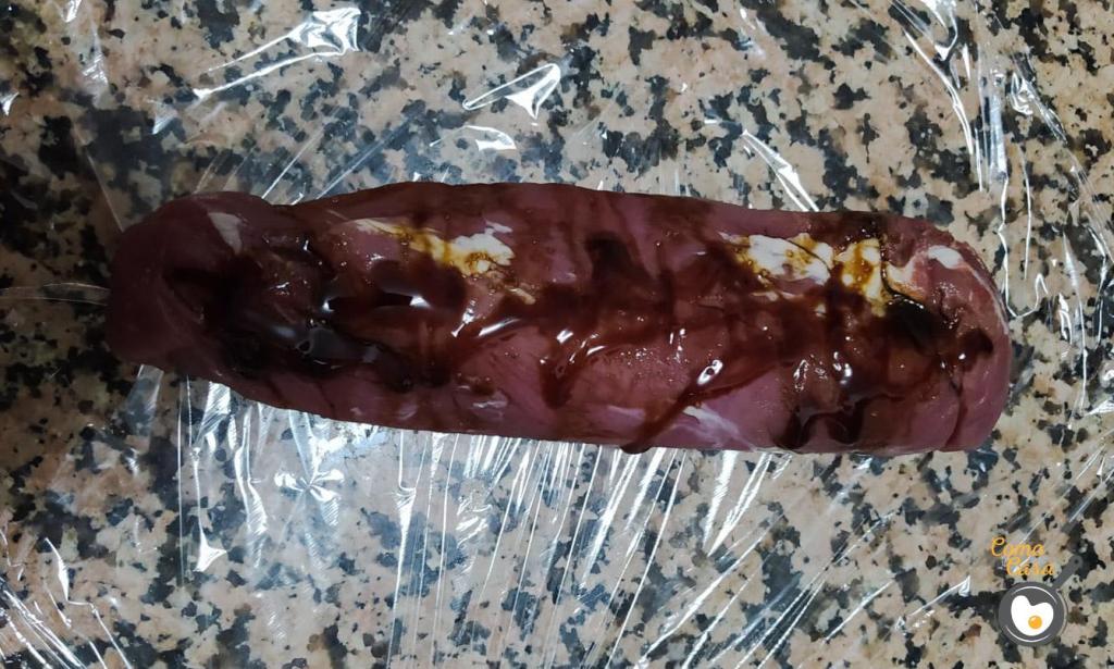 Sobre un papel transparente deposita el solomillo. Cúbrelo con las especias, la salsa de soja, el aceite de oliva y el caramelo líquido.