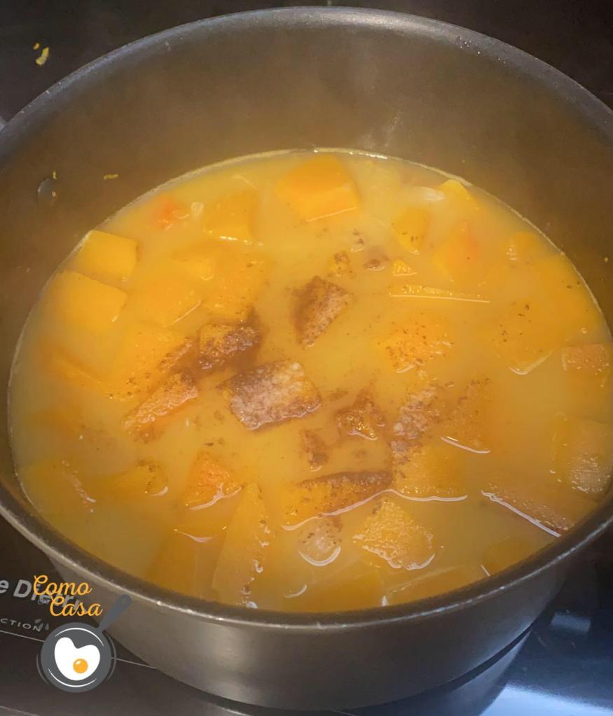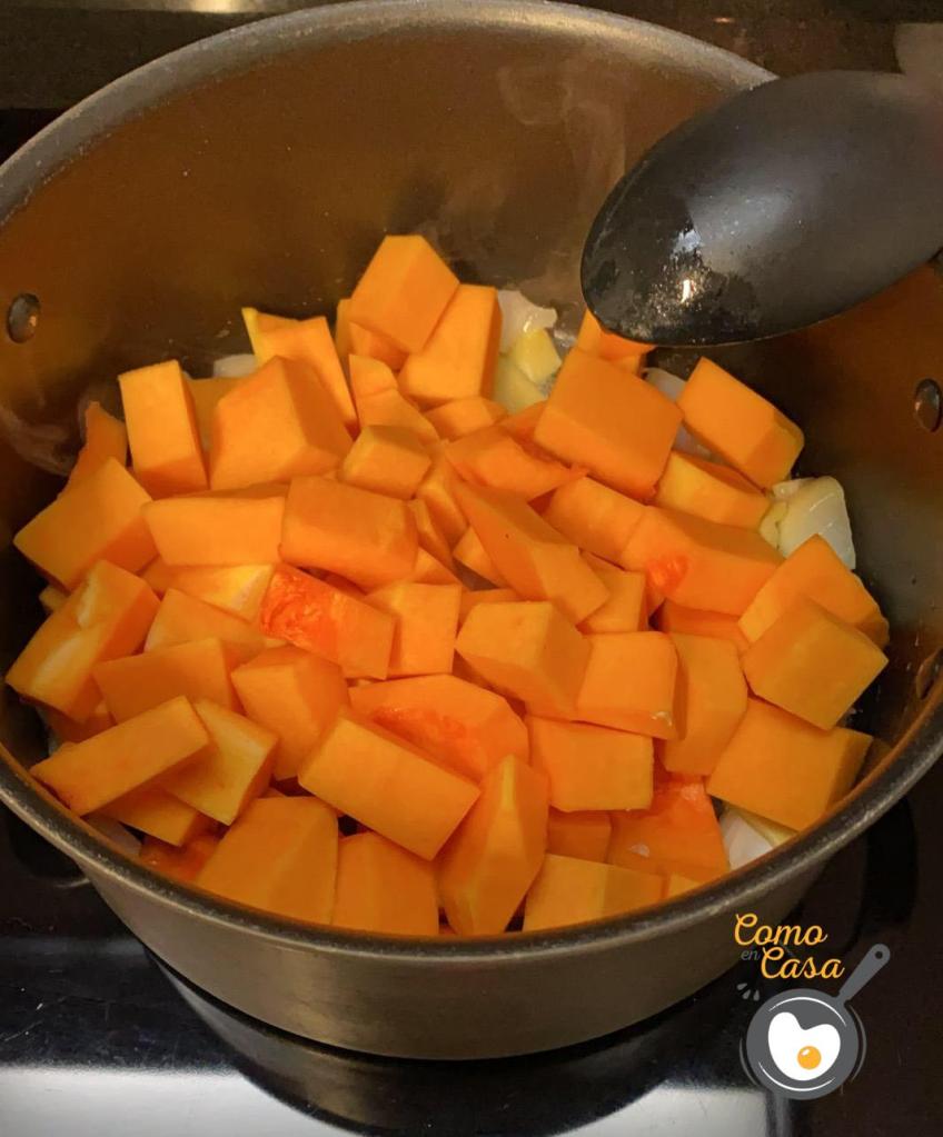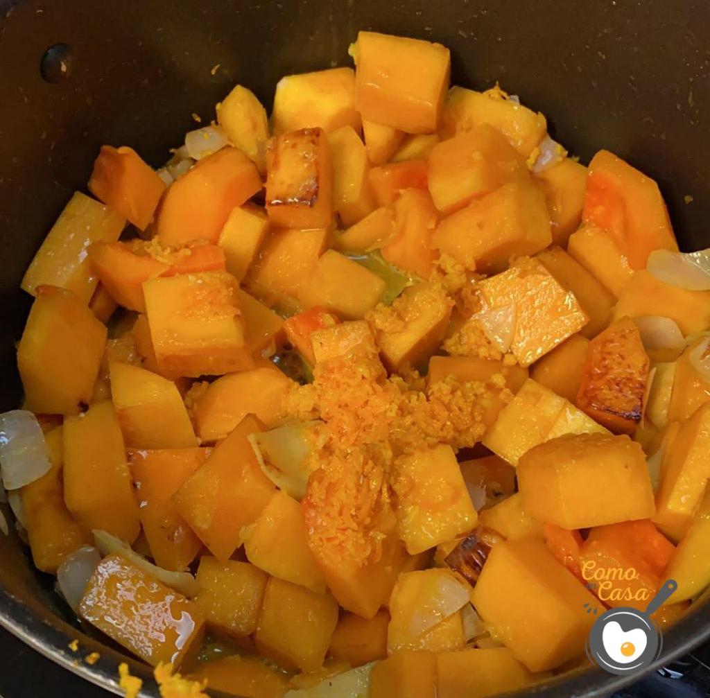 El siguiente paso consiste en añadir la calabaza y sofreírla durante unos tres minutos. Tiene que tostarse un poco.