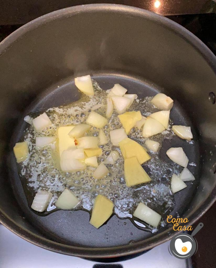 En una olla poner un poco de mantequilla a calentar. Cuando ya esté derretida, echar el jenjibre y la cebolla. Dejar que se doren un poco.