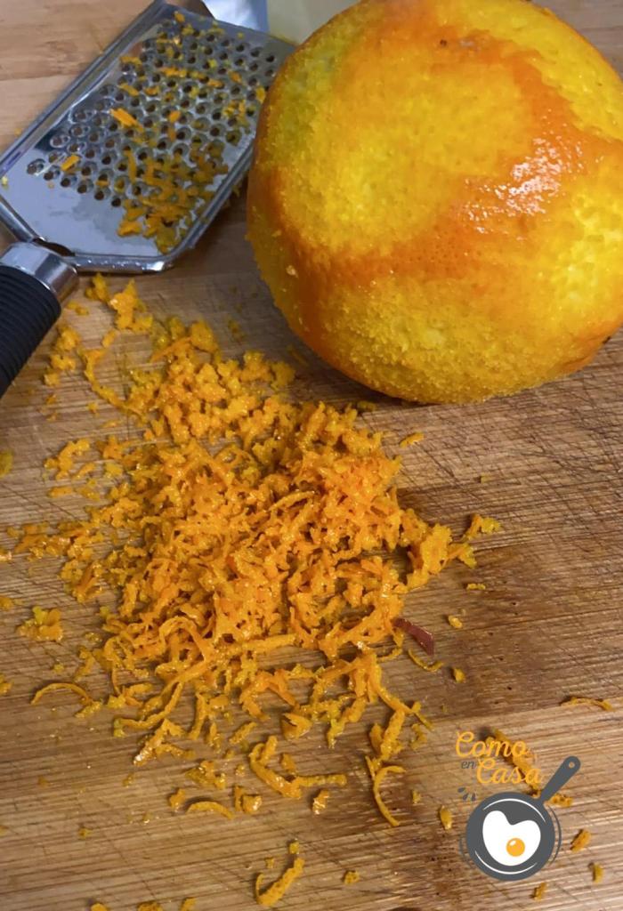 Mientras se cocina aprovecha para rayar la piel de la naranja. Así como aparece en la imagen. Recordarte que, si rayas hasta la piel blanca, puedes aportar amargor a la receta.