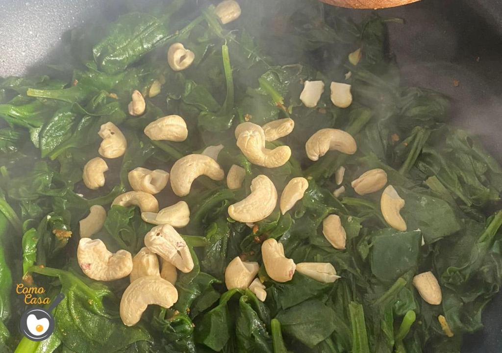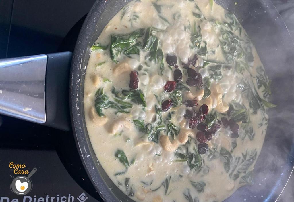 Cuando las espinacas estén pochas agrégale los anacardos y los arándanos. Continúa removiéndolo todo y déjalo cocinar.