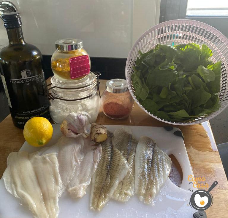 En una sartén comienza poniendo aceite de oliva a calentar. Lamina los ajos y ponlos a refreir junto con el curry. Añádele el jenjibre rallado y remuévelo todo muy bien. Cuando se haya tostado un poco, añade las espinacas y remueve para que se impregnen con las especias.