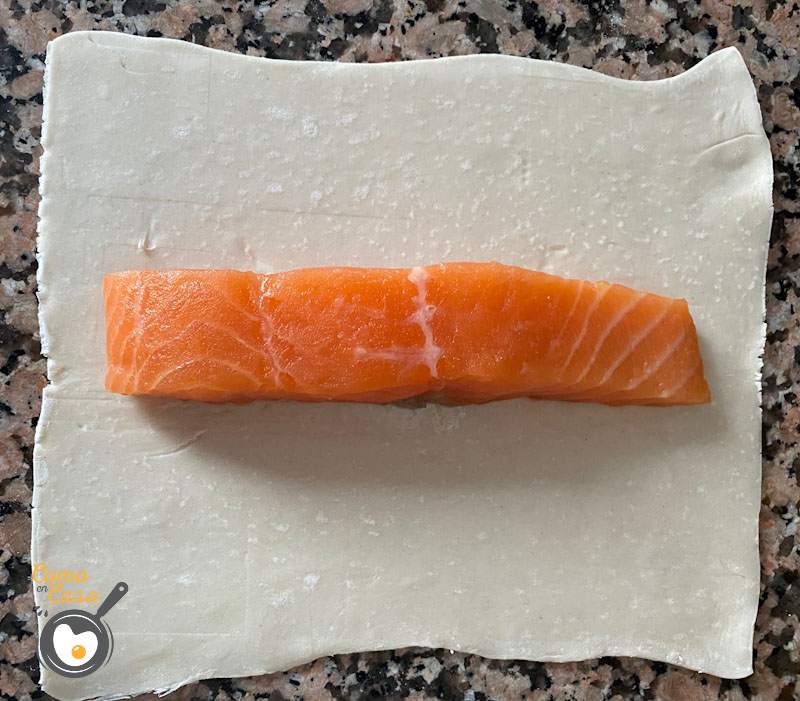 Comienza estirando la masa de hojaldre. Déjala finita. En el centro pon el lomo del salmón.