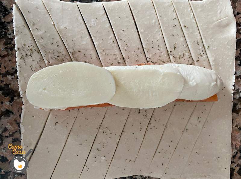 Corta en lochas la mozarela fresca y ponlas sobre el salmón, espolvoréale eneldo y sal al gusto de cada uno.
