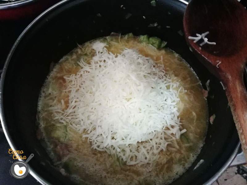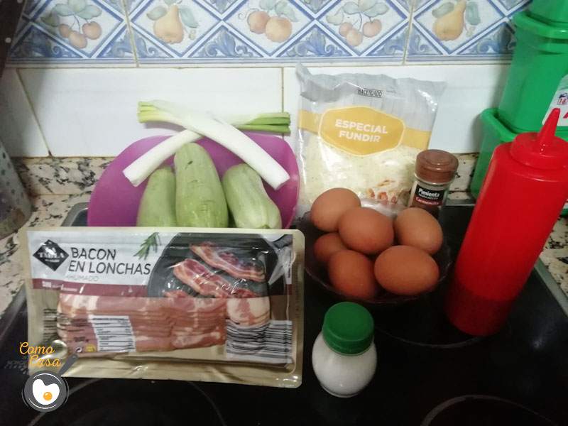 Refríe todo, que suelte el bacon bien su jugo, y le incorporas los calabacines cortados también a taquitos pequeños.