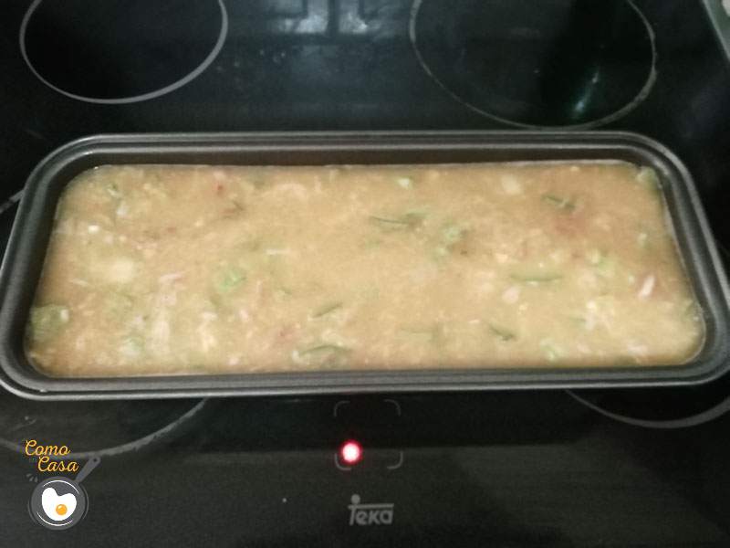 Prepara un molde para hacer el pastel. Echa el revuelto y lo mueves un poco para igualarlo. Ya solo tienes que llevarlo al horno ya precalentado a 170° durante 30/35 minutos.
